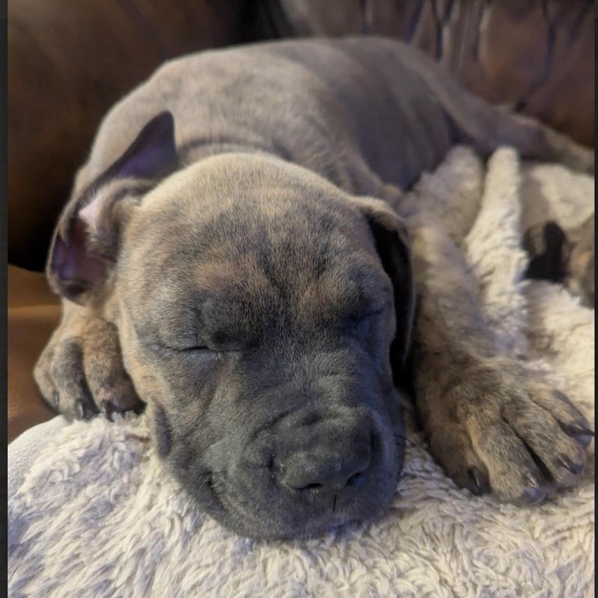 Victoria is a 10-week-old Great Dane/Mastiff mix with a giant heart and an even bigger love for snuggles. This sweet girl is delightfully snorty, wonderfully affectionate, and fully convinced she’s a tiny lap dog (despite those growing paws!). She has a gentle, soulful nature and loves nothing more than curling up close, soaking in all the cuddles she can get. Victoria’s calm, loving personality makes her the perfect companion for anyone looking for a devoted best friend who will happily trade playtime for snuggle time. If you’re ready for a little (big) shadow who will adore you endlessly, Victoria is your girl. Spay and first two sets of shots/worming and chip are included in her fee. Please do the application at https://www.homewardboundrescue.com/application/dog